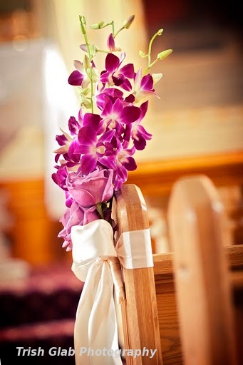 The lovely orchid and rose pew dressing.